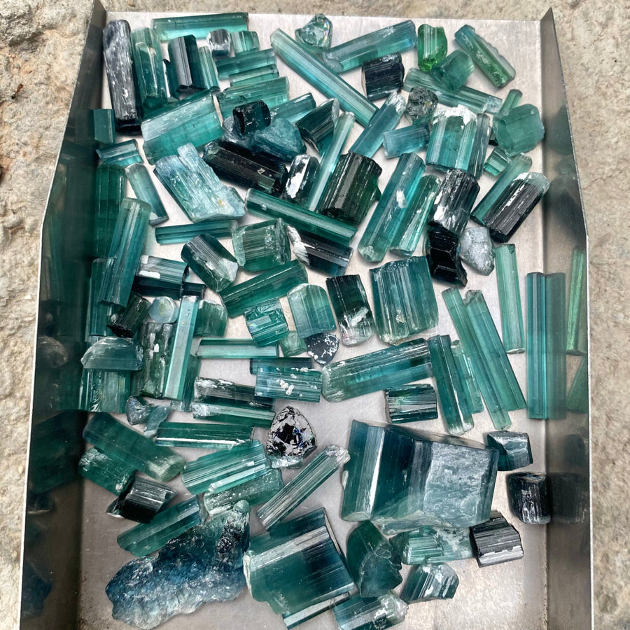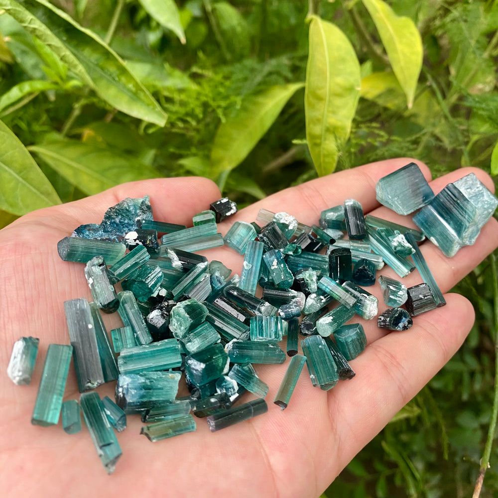 Explore the beauty of this rare 76.5-gram lot of natural Blue Tourmaline crystals in the desirable Indicolite shade, featuring vibrant tones ranging from deep teal to oceanic blue. These unheated, natural crystals are sourced from Afghanistan and exhibit a mix of terminated and raw forms, perfect for collectors, crystal healers, and jewelry artisans.