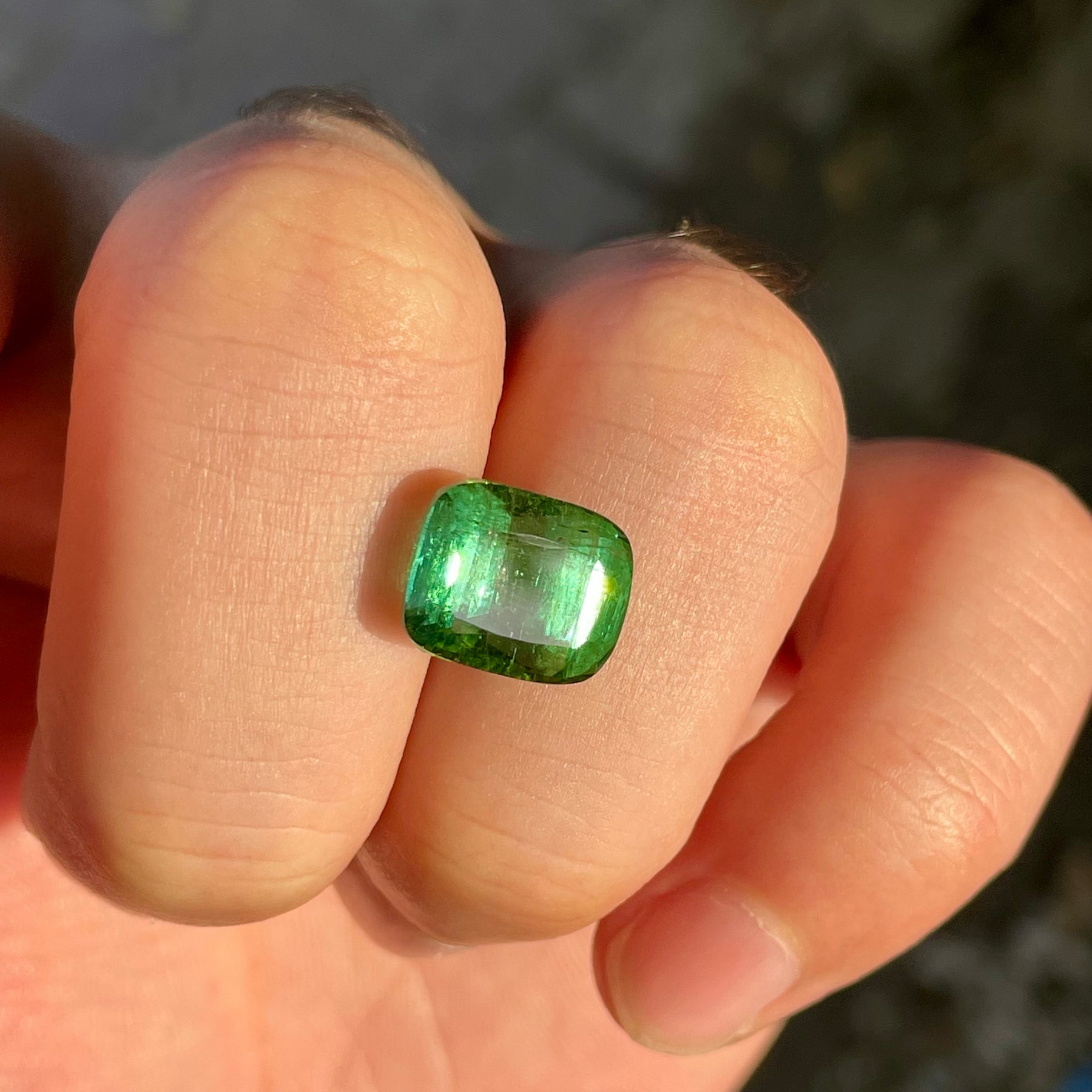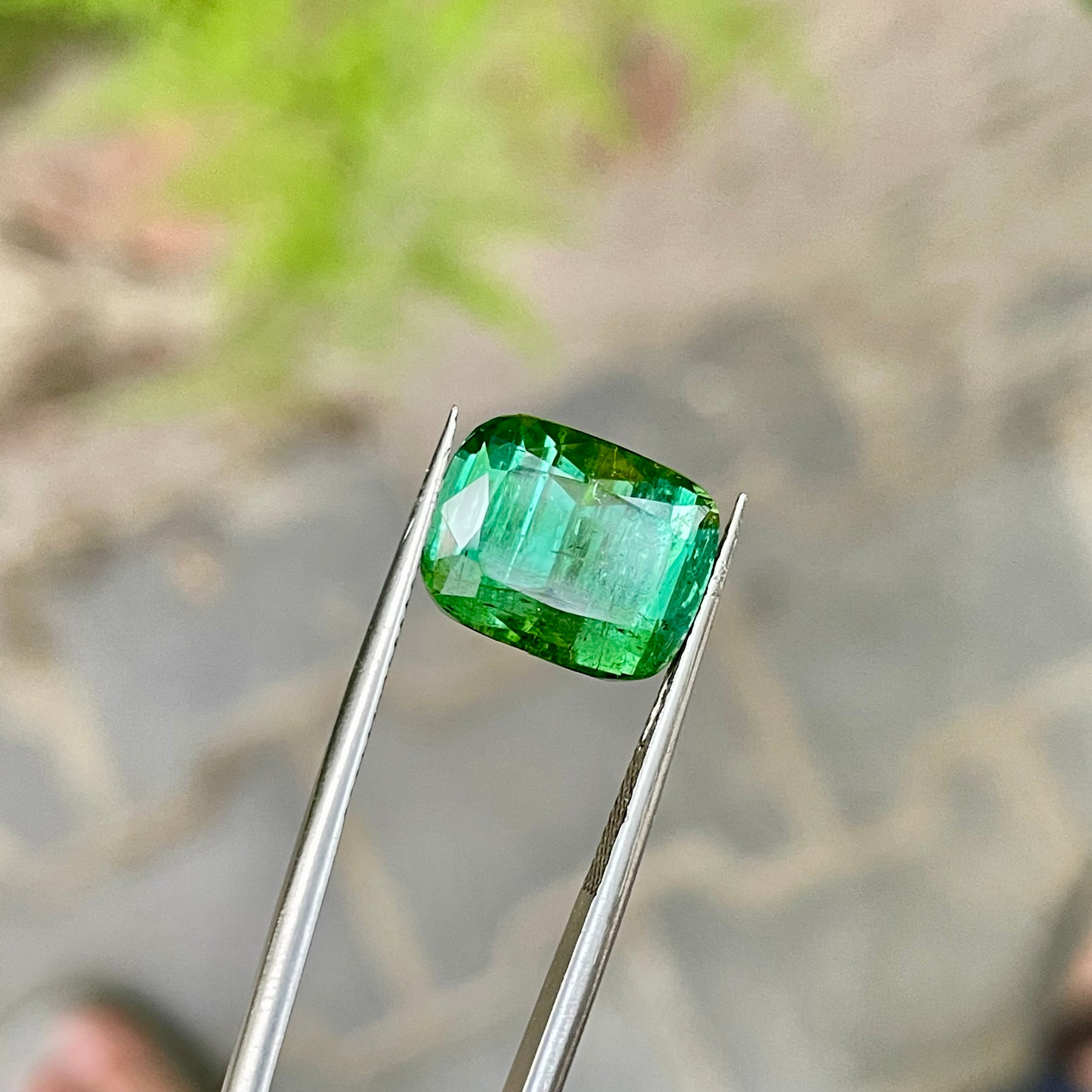 Striking faceted vivid green tourmaline in a bold cushion cut, perfect for creating statement vintage-style jewelry. This large natural gemstone radiates deep, vibrant green tones with excellent brilliance and clarity. Ideal for collectors and designers seeking a timeless gem that embodies elegance and classic charm.